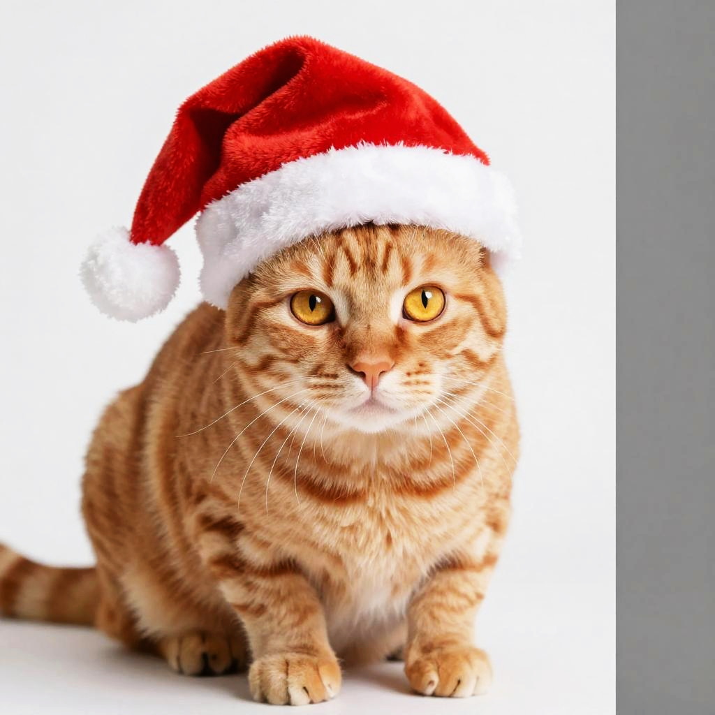A cute, orange tabby cat with bright yellow eyes is wearing a red and white Santa hat. The cat is crouched down, looking directly at the camera with a slightly curious expression. The background is a simple white, making the cat and Santa hat stand out. The image has a gray border on the right side. The cat's fur looks soft and fluffy.