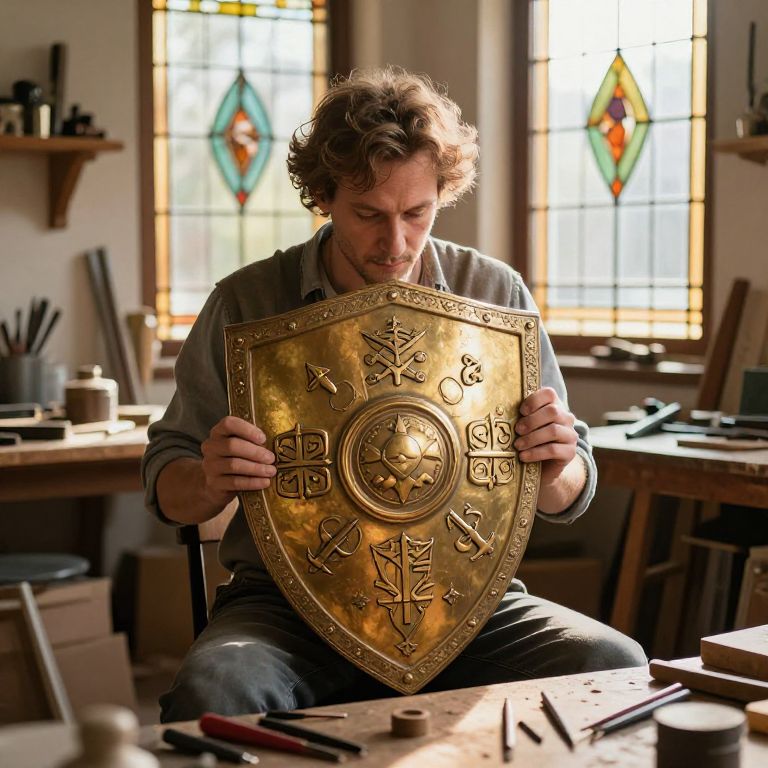 Shield creator focused on designing an ornate, golden shield embossed with intricate symbols of protection, seated in a sunlit artisan studio with stained glass windows and tools scattered around, warm and inviting ambiance.