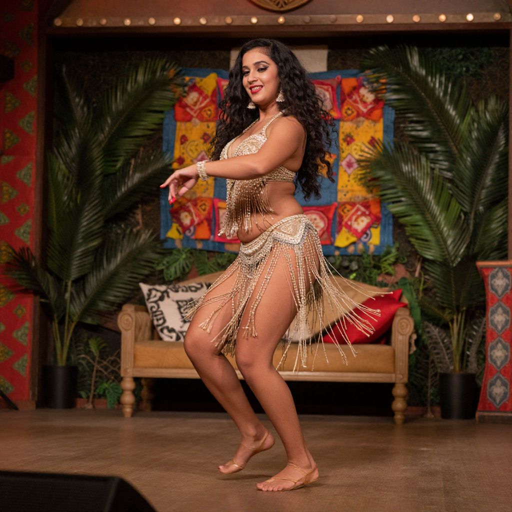 An exotic dancer with long, wavy black hair and a warm, inviting smile performs on a vintage-themed stage covered in palm leaves and colorful fabrics. She wears a beaded, fringe-covered costume designed to mimic a traditional South Asian rhythm style, moving with grace and rhythm, her body undulating in time with the beat beneath soft, dappled stage lighting.
