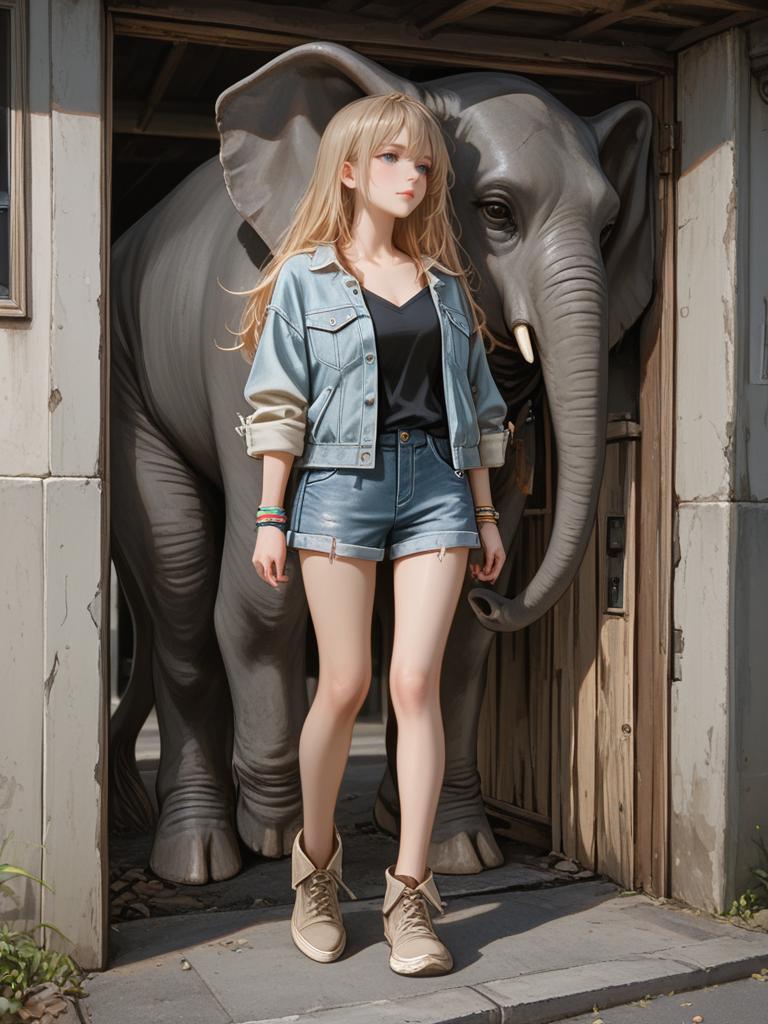 Photograph of a young woman with long, straight blonde hair and fair skin standing confidently in front of a large, dark gray elephant. She is wearing a light blue denim jacket, black V-neck t-shirt, high-waisted blue denim shorts, and beige lace-up boots. The elephant is partially visible through a wooden doorway, its trunk and ears prominent. The background includes weathered wooden doors and gray stone flooring. The woman's expression is neutral, and she stands with her arms relaxed by her sides. The lighting is natural, highlighting the textures of her clothing and the elephant's skin.