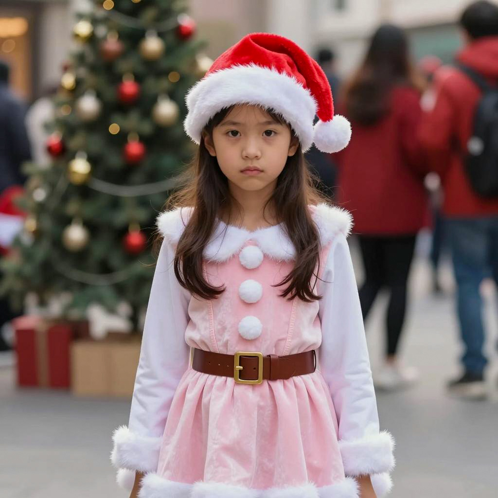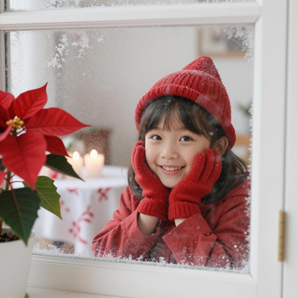Young girl with short black hair and red hat, wearing red coat and gloves, smiles through a frost-covered window. Red poinsettia on left, white tablecloth with red patterns in background. Candles visible through window. Indoor setting.