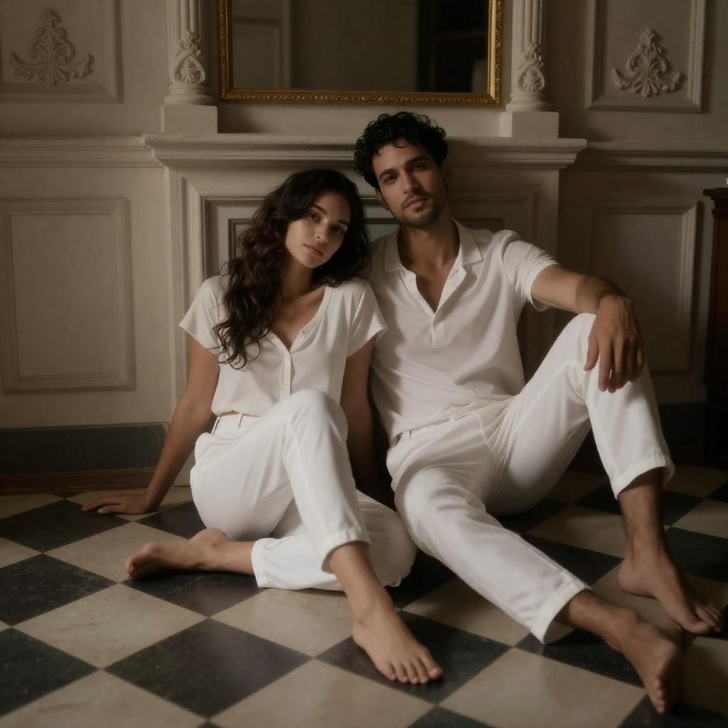 A photograph of a man and woman in white outfits, sitting on a checkered floor in a dimly lit, ornate room. The woman leans against the man, who has his arm around her. Strong light casts dramatic shadows, highlighting their relaxed, intimate pose.