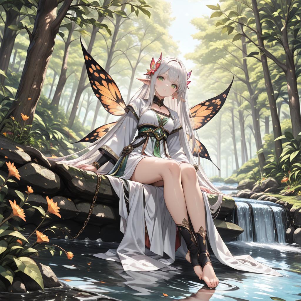 (((masterpiece))), (((best quality))), ((ultra-detailed)), (illustration), ((an extremely delicate and beautiful)), dynamic angle, floating, (beautiful detailed eyes), (detailed light) 1girl, pointy ears, long hair, water, solo, elf, sitting, half body, white hair, chain, green eyes, toeless legwear, barefoot, jewelry, looking at viewer, feather, leaves, nature, (sunlight), river, (forest), (painting), (sketch), (bloom), (portrait:1.2), (butterflys:1.2), (tyndall effect), obscure, hanfu