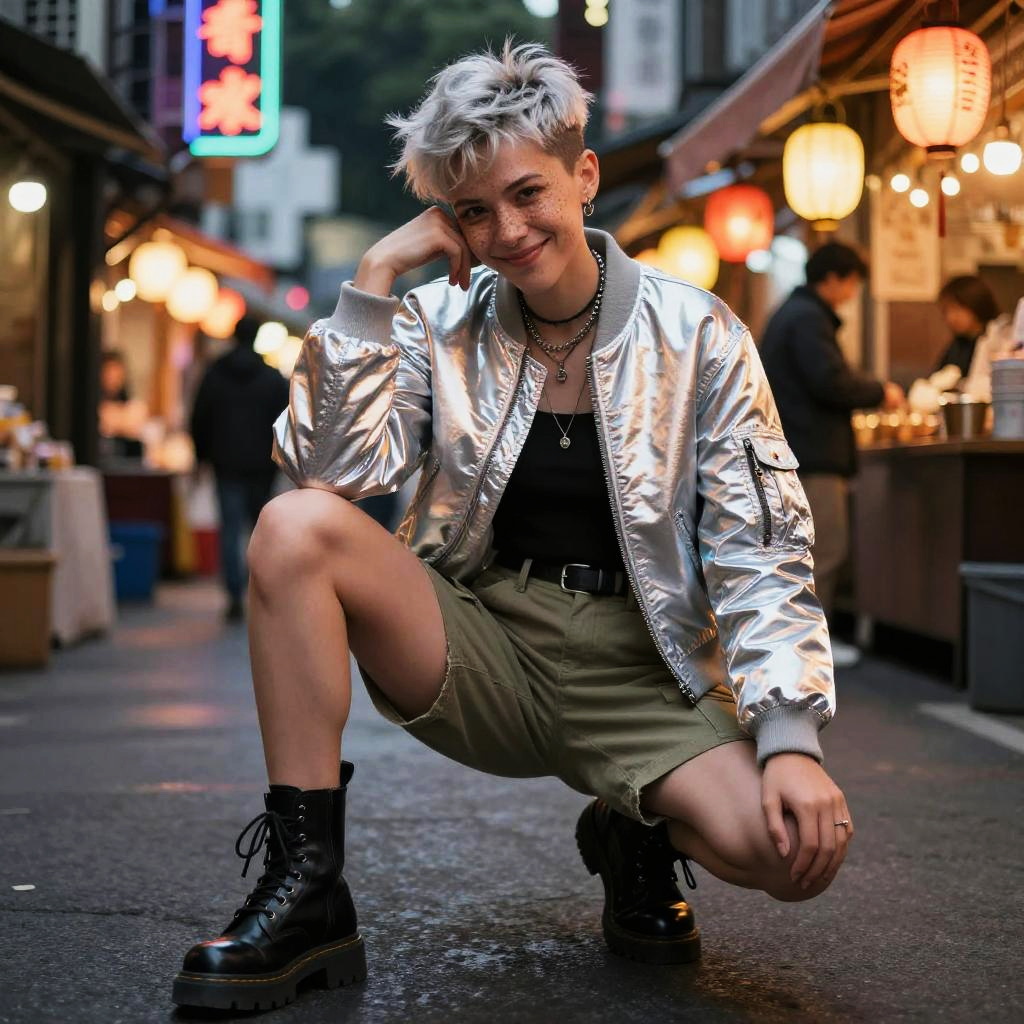 Non-binary person with silver undercut and freckles sitting in a night market alley, wearing a reflective silver bomber jacket, cargo skirt, and combat boots, with mixed neon and paper-lantern lighting and a mischievous smirk