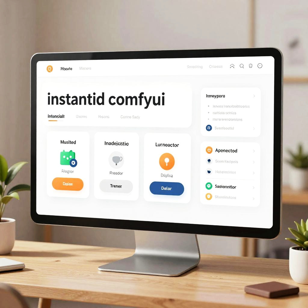 Instantid comfyui concept art showing a warm, inviting user interface for AI models, clean typography, intuitive layout with modular blocks, soft shadows, gentle animations, high-tech workspace background with plants