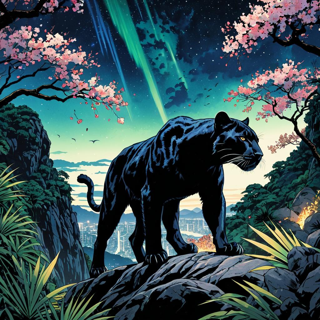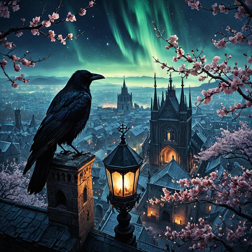 Peregrine Falcon Over Misty Fjord with Aurora and Cherry Blossoms