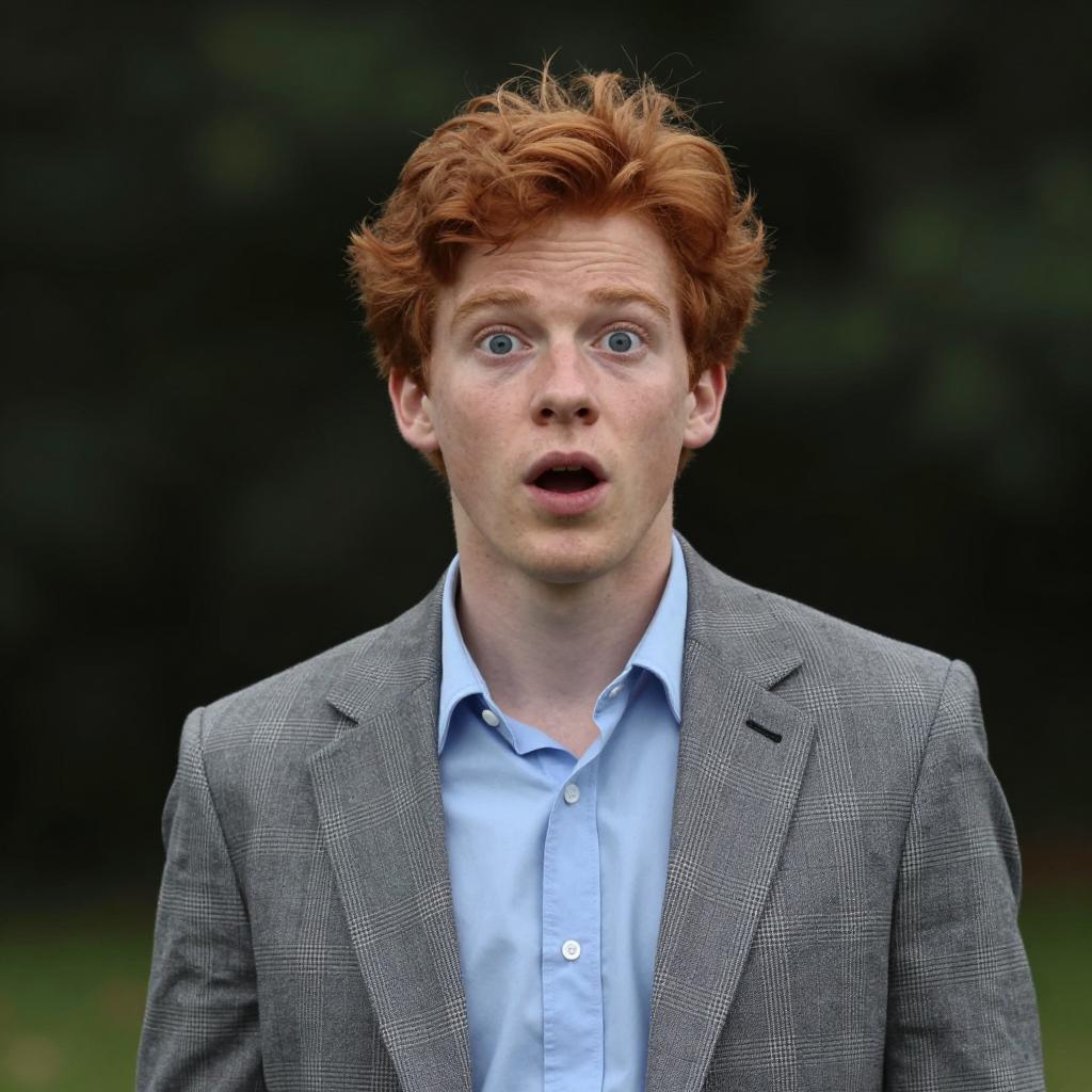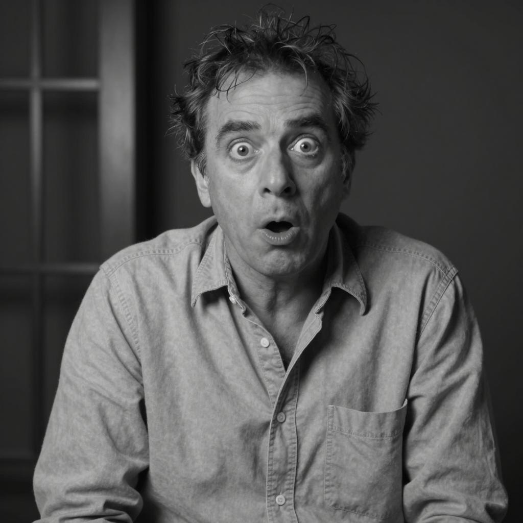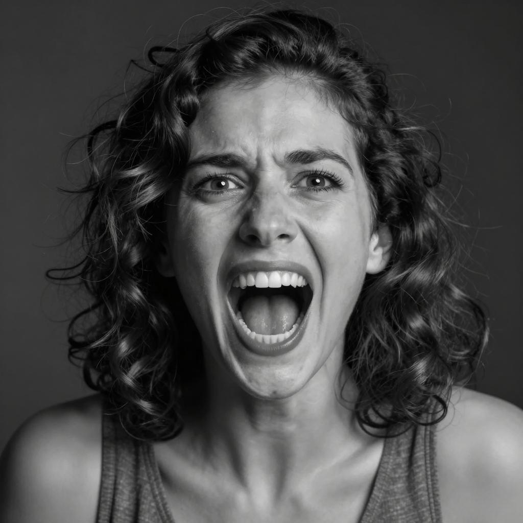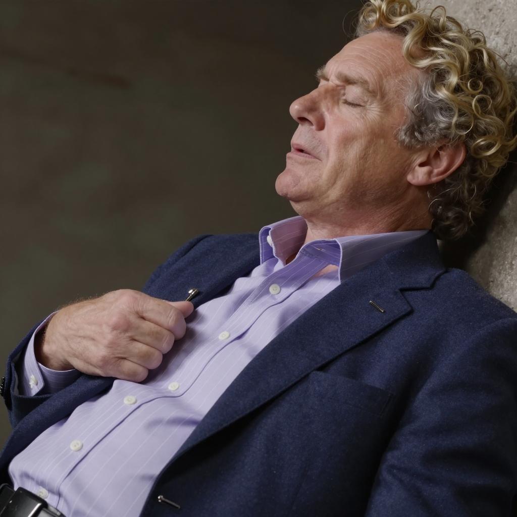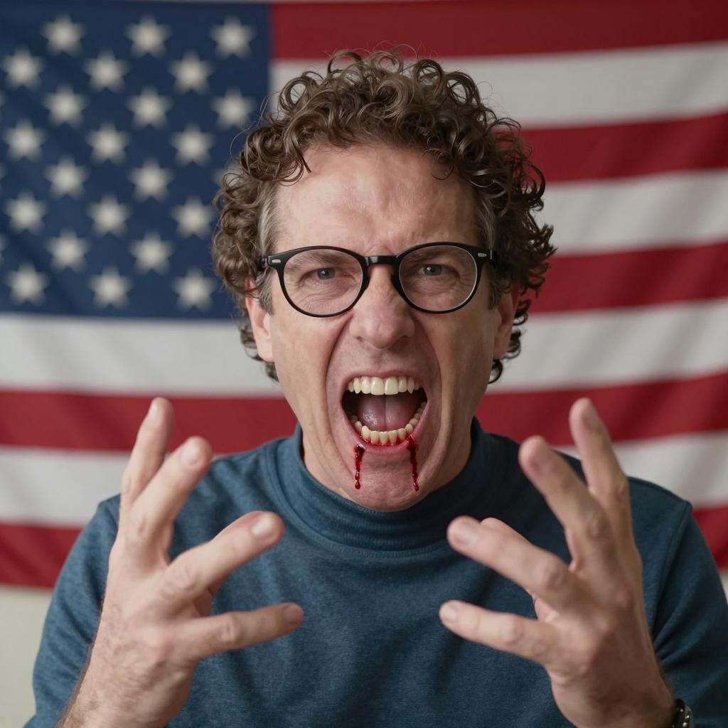 Middle-aged man with curly red hair and black glasses, wearing a blue jacket, screaming with mouth open, holding a tan, wrinkled hand in his left hand. Background is blurred. Man's face is distorted in anger or pain. Single ring on his right hand.
