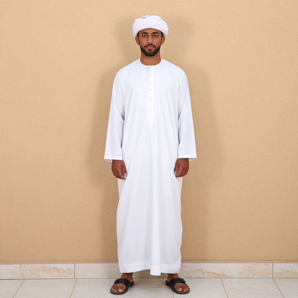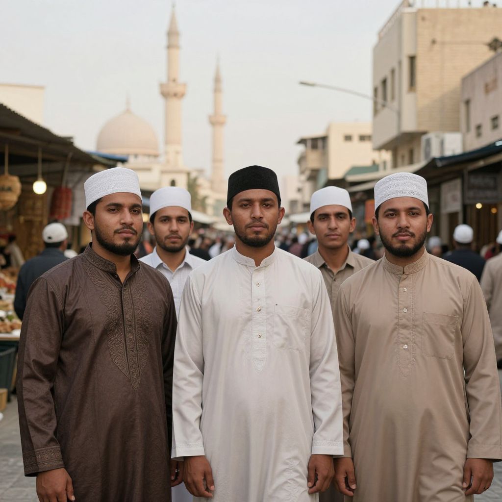 Handsome Muslim men gathered in a serene courtyard, wearing elegant thobes and kufis, lush greenery around, soft natural light filtering through trees, capturing the warmth of friendship and faith, detailed textures and rich colors, ultra-realistic portrait style.