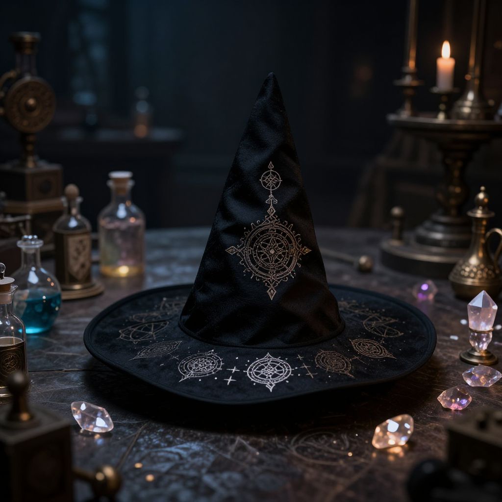 Mysterious dark witch hat with intricate white embroidery, centered on a black plate, surrounded by glowing crystals and candles in a dimly lit, magical workshop