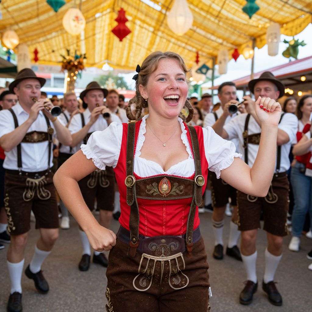 A vibrant, high-resolution shot of a lively woman wearing a bright, custom-made lederhosen costume at an Oktoberfest parade in Germany, mid-laugh as she dances with a group of traditional musicians. She has freckles across her nose, rosy cheeks, and a mischievous grin, wrapped in a red lederhosen with leather belt, standing in a crowd of joyful festival-goers under a golden sky with paper lanterns and flutes playing in the background.. The woman has big tits and cute face