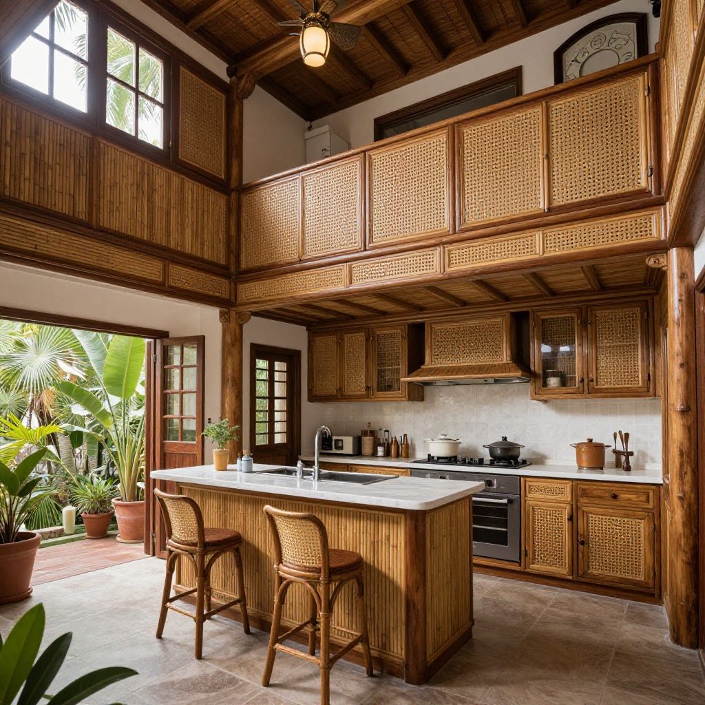 (masterpiece), (high quality), best quality, real, (realistic), super detailed, (full detail), (4k), 8k, interior, public and kitchen room /imagine prompt: IndoChine single duplex, style: east-west fusion, tropical elegance, woodwork, bamboo texture, rattan patterns, historical significance, artistic beauty, serene, nostalgic, architecture, cultural heritage --ar 16:9 --s 1000