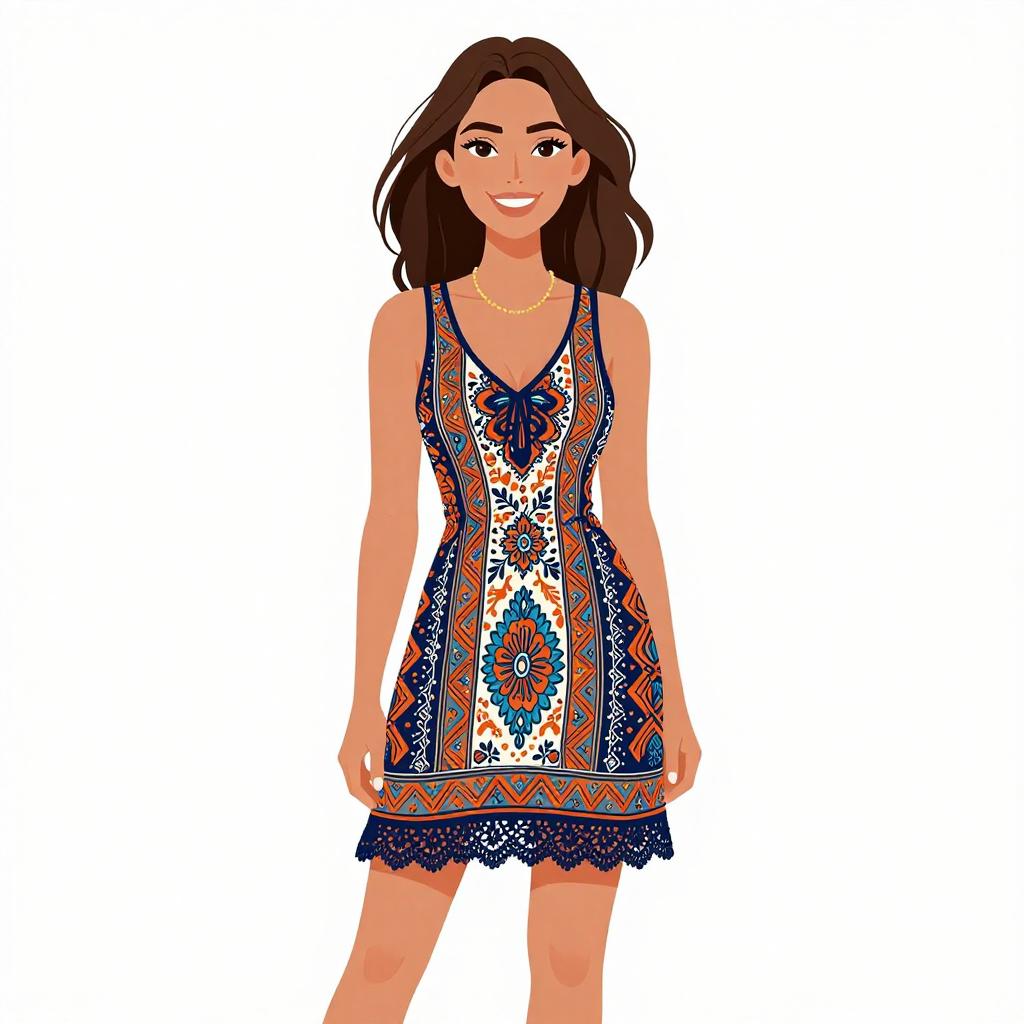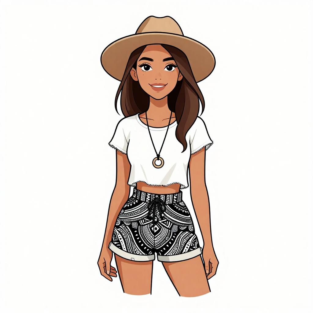 Woman with pretty face and pretty hair. smiling Woman, bohemian, short A-line dress with pastel tribal prints, round neckline, short sleeves, textured edges, paired with a light beige floppy straw hat, plain white wall background --sref 1467