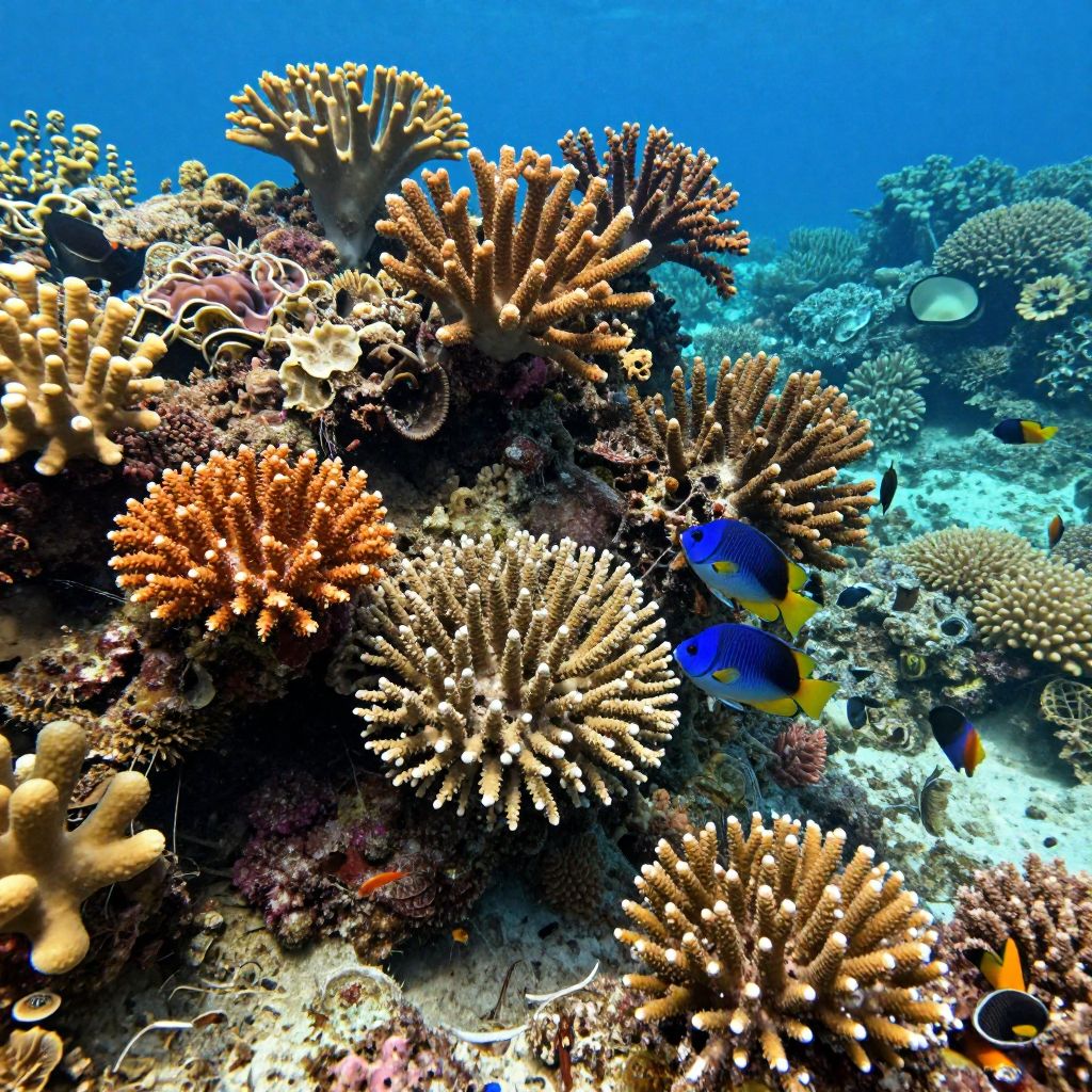 Photograph of vibrant underwater coral reef, featuring white and orange branching corals, surrounded by diverse sea anemones and colorful sponges, set