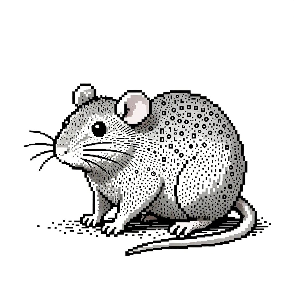 Rat ascii art illustrating a small rat in a curled position, artistically formed by a collection of punctuation and alphanumeric symbols, arranged to simulate shading and depth in a high contrast monochrome palette, evoking nostalgia for early computing.
