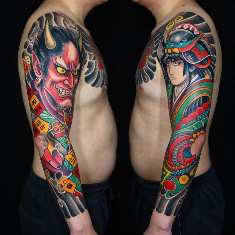 Photograph of two detailed, colorful tattoo sleeves on a man's upper body. The left sleeve features a fierce, anime-style demon with black hair and sharp eyes, surrounded by swirling patterns and small, vibrant characters. The right sleeve shows a majestic, traditional Japanese-style warrior with a calm expression, surrounded by intricate designs and a red dragon. The tattoos are vivid and highly detailed.