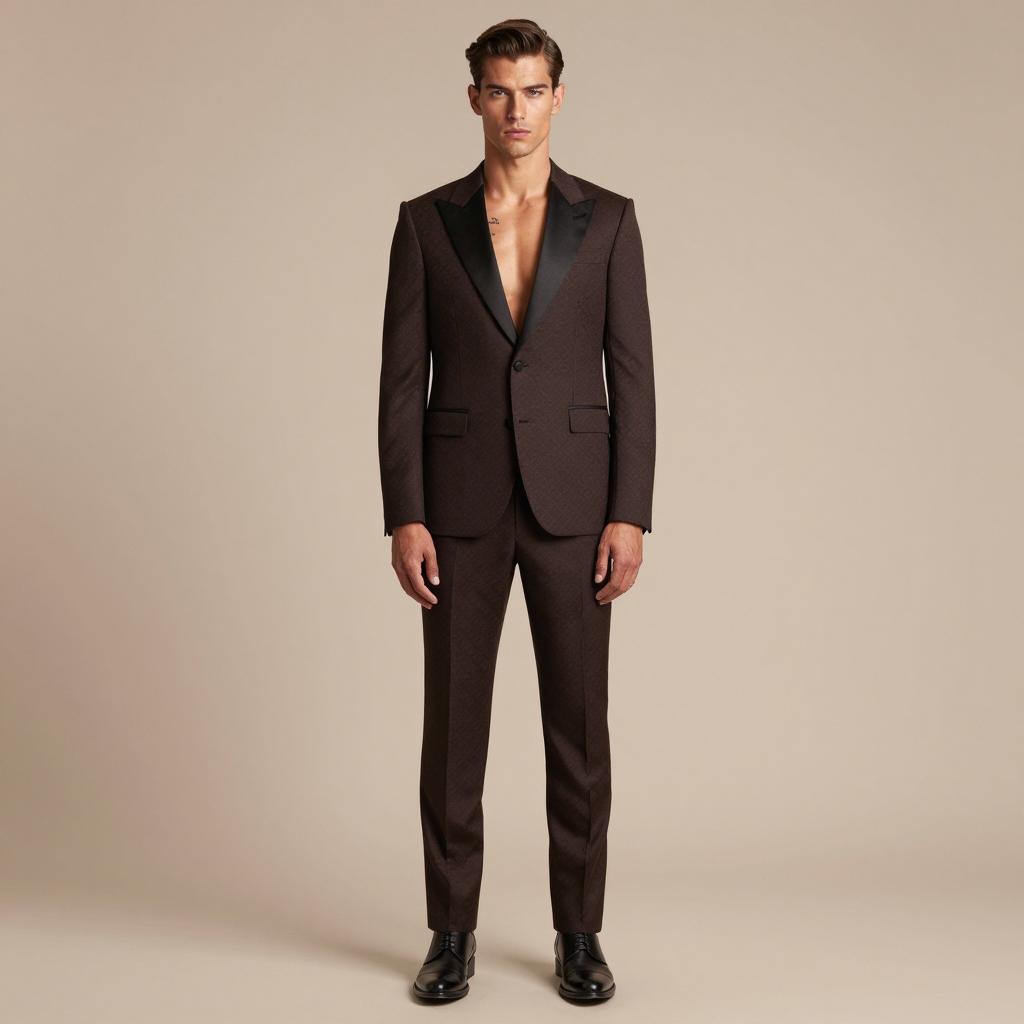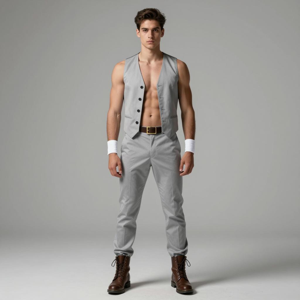 Party time costume, photograph of a young, muscular man standing, full body, light gray sleeveless vest, light gray pants, white wristbands, brown boots, brown belt with gold buckle, open vest revealing chest, short dark hair, light skin, neutral background, studio lighting, serious expression, full frontal, standing on a white surface, soft shadows, fashion photo, contemporary style