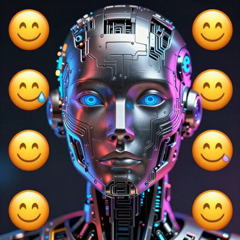 Photorealistic CGI image of a futuristic, metallic human-like robot with glowing blue eyes, intricate circuitry patterns on its face, and neon pink and blue light accents. The robot's expression is neutral, and it has a sleek, robotic head with visible ports and wires. Surrounding the robot's head are eight bright orange smiley face emojis with black outlines, evenly spaced against a dark, blurred background. The overall composition combines a cyberpunk aesthetic with a playful, digital element.