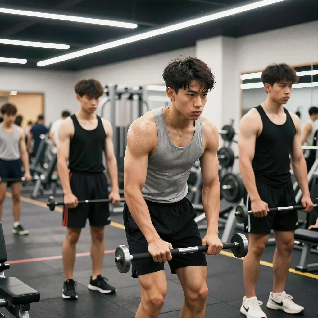 Teen bodybuilders training intensely in a modern gym, muscles defined and sweat glistening, vibrant colors, dynamic lighting, realistic anatomy, powerful and focused expressions