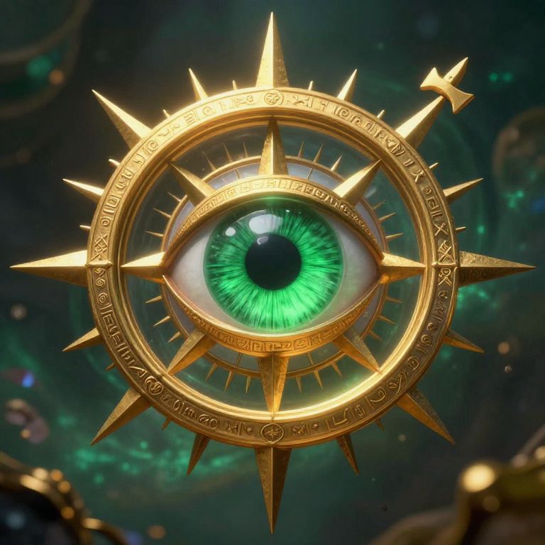 A digital CGI image features a vibrant green, glowing eye at the center of a golden, spiked, circular frame resembling a sun. The eye has intricate, radiant green and white irises, surrounded by a glass-like dome. The frame is inscribed with mystical symbols in an ancient style. The background is a dark, starry, cosmic space with hints of green and blue, enhancing the celestial theme. The image combines elements of fantasy and science fiction, with a high level of detail and vibrant colors.