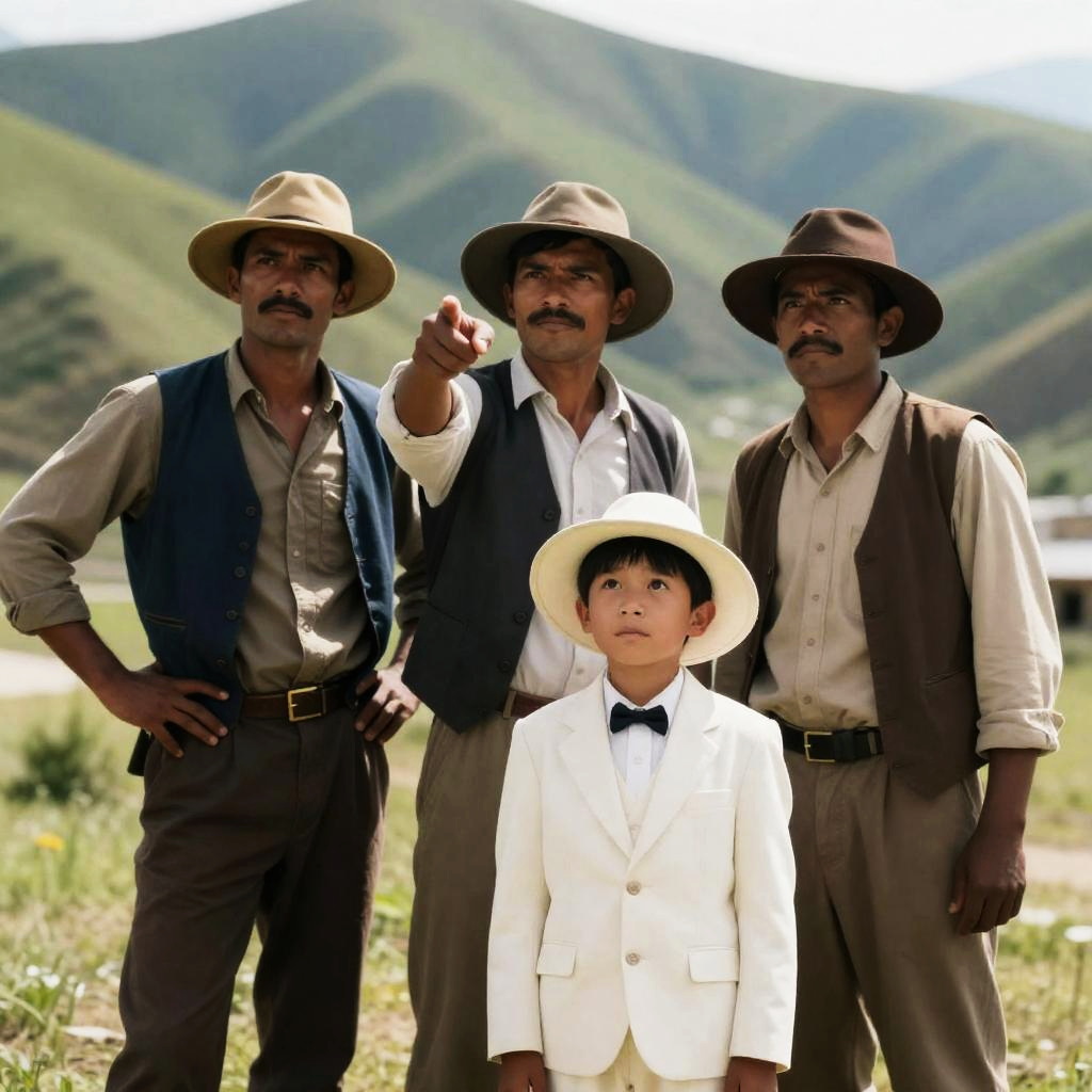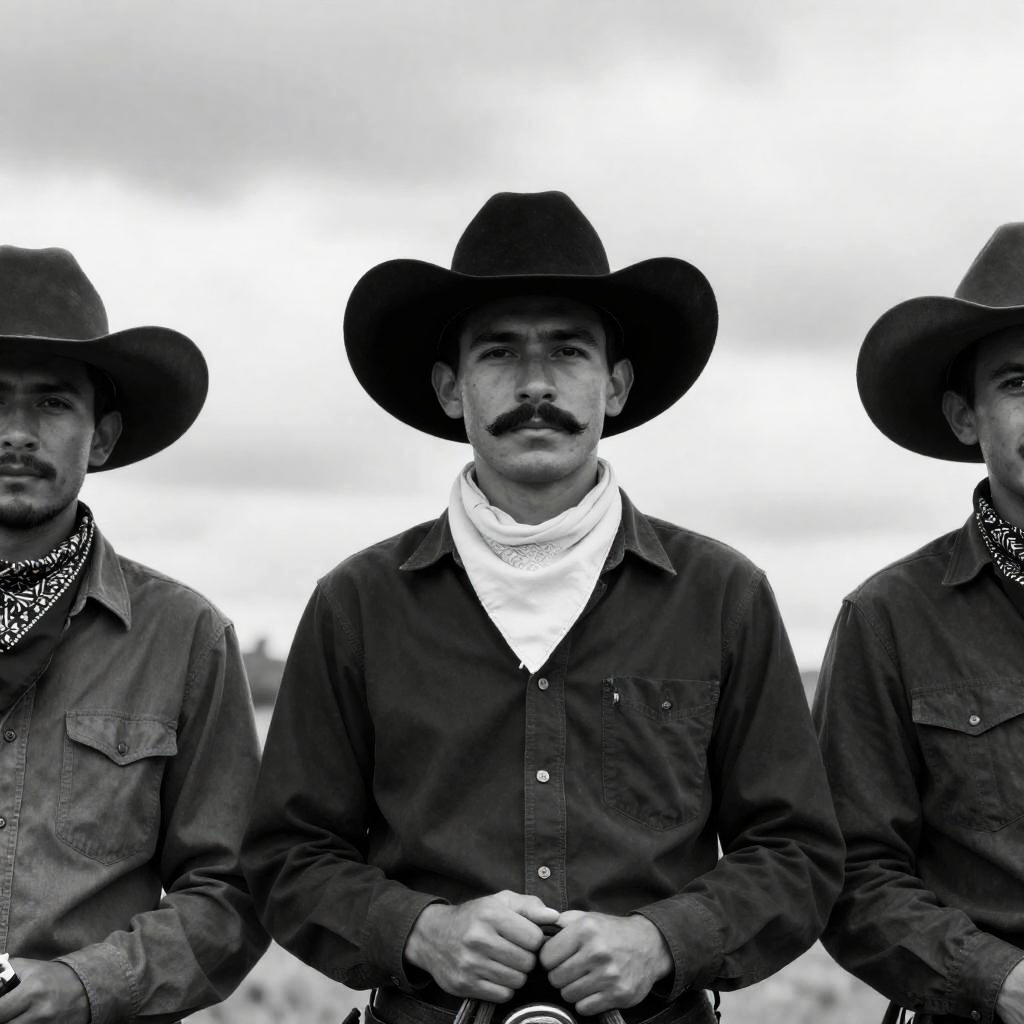 Photograph of two men in blue uniforms with suspenders, beige and yellow neckerchiefs, and cowboy hats. The man on the left has a mustache, the man on the right has short, wet hair. Clear blue sky background with blurred figures and wooden structures. Both men have neutral expressions. One man's shoulder patch is visible.