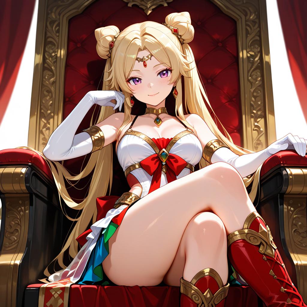 Masterpiece, best quality, highres, 1girl, aausagi, double bun, twintails, parted bangs, hair ornament, circlet, jewelry, earrings, choker, see-through, red bow, white gloves, elbow gloves, multicolored skirt, sitting, throne, crossed legs, smile, red footwear, knee boots