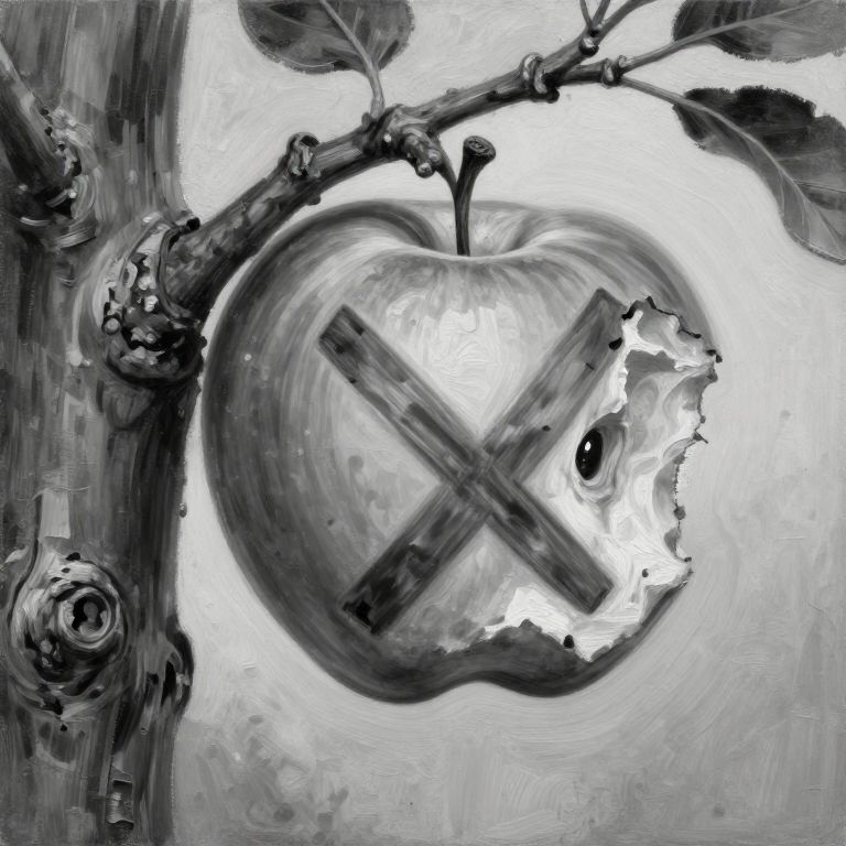 A digital drawing in a monochromatic grayscale palette depicts a realistic, textured apple with a large X marked through its center, creating a noticeable bite taken out of the right side. The apple is attached to a tree branch with detailed bark and leaves. The background is a white gradient, contrasting with the dark, shadowy tree and apple. The X is bold and crossed diagonally over the apple, symbolizing prohibition or rejection. The drawing uses thick, expressive brush strokes, giving it a painterly feel. The tree branch and leaves are on the left side, with the apple centrally positioned.