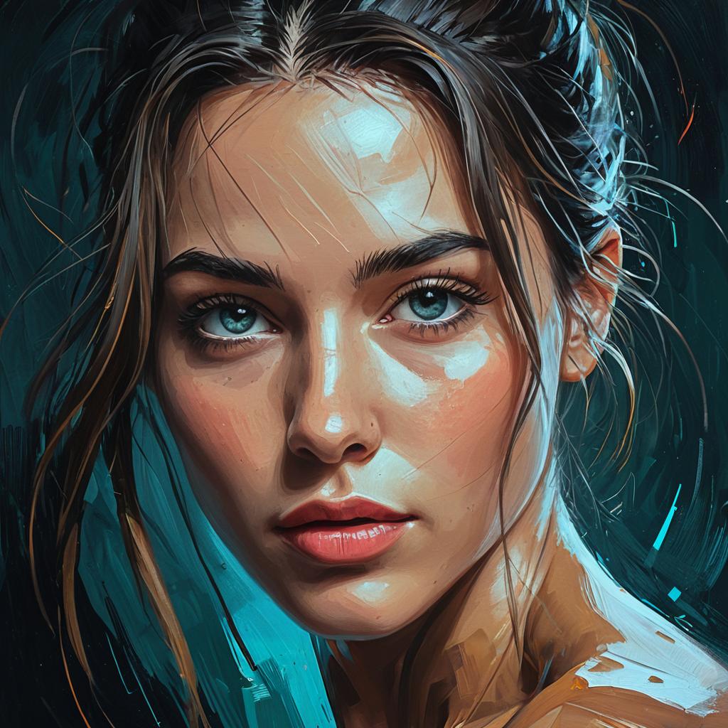 Highly detailed expressionist oil painting of a beautiful young female character with blue-green eyes and wavy dark hair in a loose style. The artwork features pastel impasto textures with intricate brush strokes, realistic shading, and dynamic top lighting. The background is an abstract blend of teal and pastel tones enhancing the focus on the character's perfect facial features and expressive eyes. Digital painting inspired by contemporary artists Sam Spratt and Peter Mohrbacher.