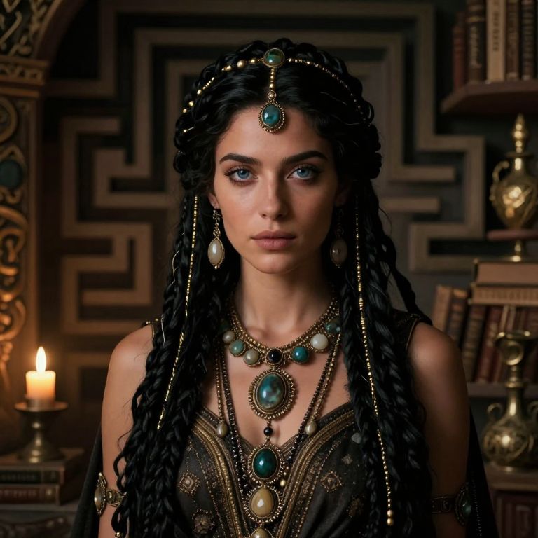 Craft a photorealistic portrait of an enigmatic female oracle with olive skin and gentle blue eyes. Adorned in intricate jewelry featuring semi-precious stones, her long black hair is intricately braided with golden thread. Using the chiaroscuro technique to emphasize light and shadow, depict her serenely amidst a labyrinthine library filled with ancient tomes and artifacts from distant lands. Soft candlelight illuminates her face, revealing an expression that conveys both wisdom and untold secrets, evoking a sense of intrigue and wonder as she meets the viewer's gaze directly. Capture this moment, inviting viewers into her world of esoteric knowledge and hidden truths.
