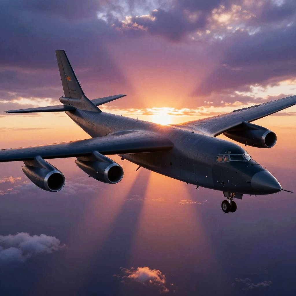 B-52 injection depicted as a powerful aerial bomber over a dramatic sunset sky, detailed B-52 aircraft flying low above clouds, rays of orange and purple light breaking through, realistic textures on metal surfaces and wings, atmospheric perspective