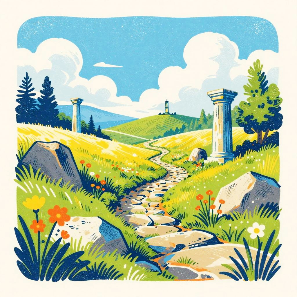 Vibrant linocut print landscape set in flowering meadow with scattered ancient ruins, bright blue sky with fluffy clouds. Oversized blue-tinted shapes frame a rocky path winding into a glowing golden field; a small landmark rests on a distant hill amid lush greenery. Saturated palette, crisp outlines, dithered textures, soft bloom, subtle fog, playful particles, storybook charm, nostalgic and hopeful.
