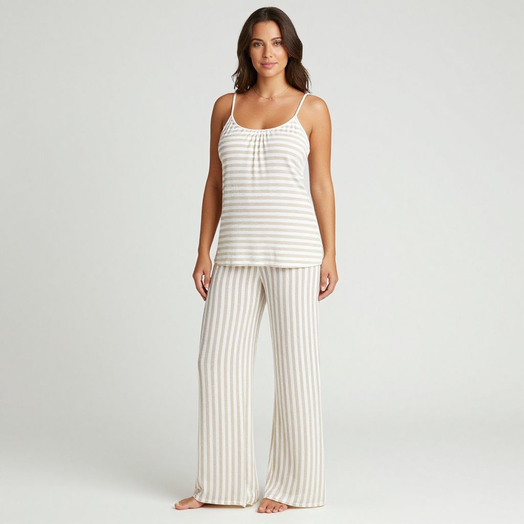 "Woman, casual beachwear, loose-fitting tank top with thin spaghetti straps and gathered neckline in a beige and white striped pattern, matching wide-leg pants, floor-length with a relaxed fit, barefoot, white studio background.. Sexy. Pretty face and beаutiful eyes. Big breasts."