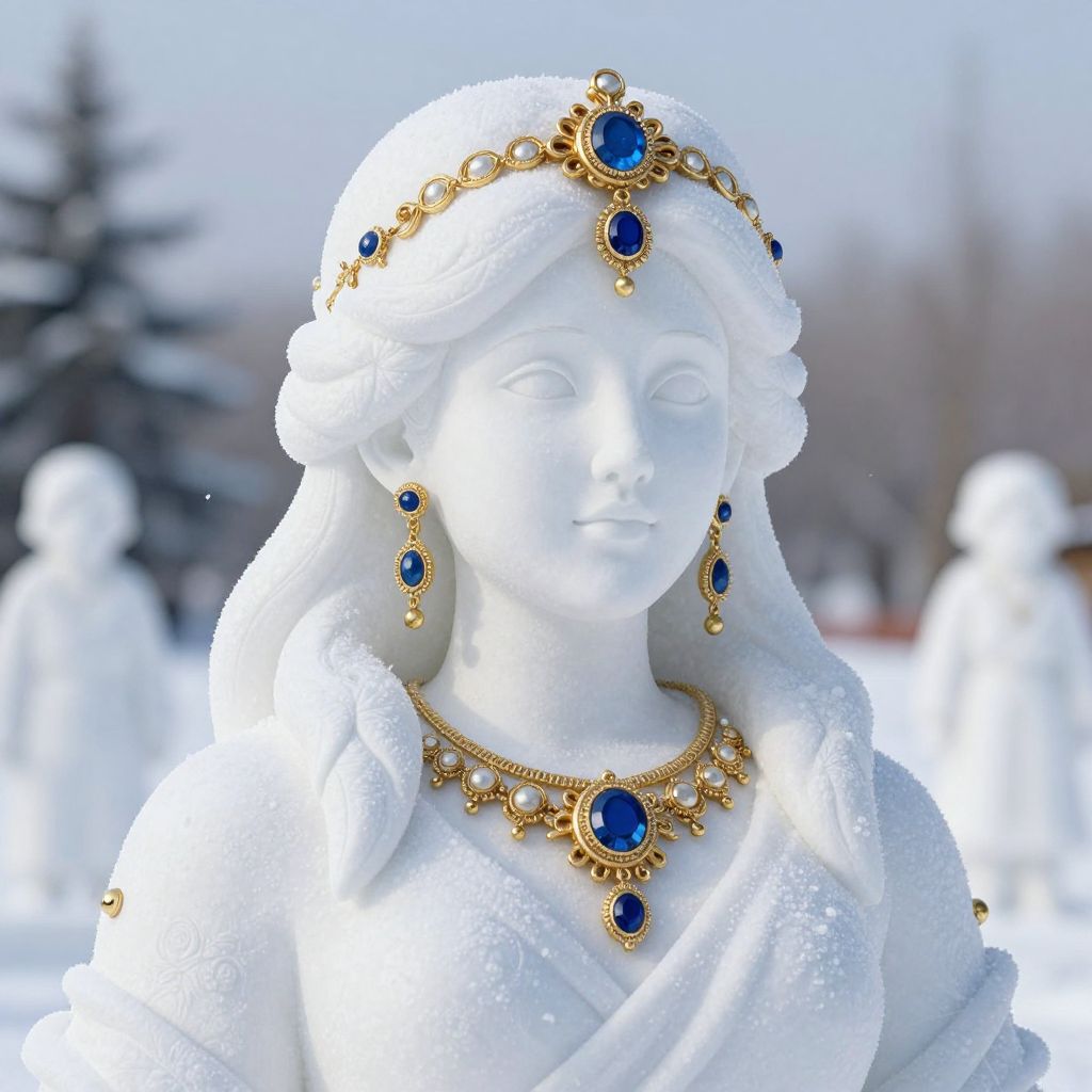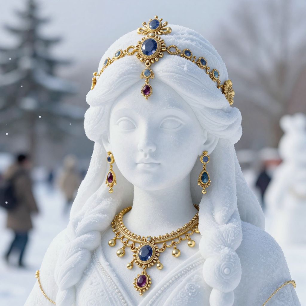 A high-definition 3D-rendered snow sculpture depicts a serene woman adorned with intricate gold and gemstone jewelry, including a headpiece and dangling earrings, set against a wintry backdrop with blurred snow-covered figures.