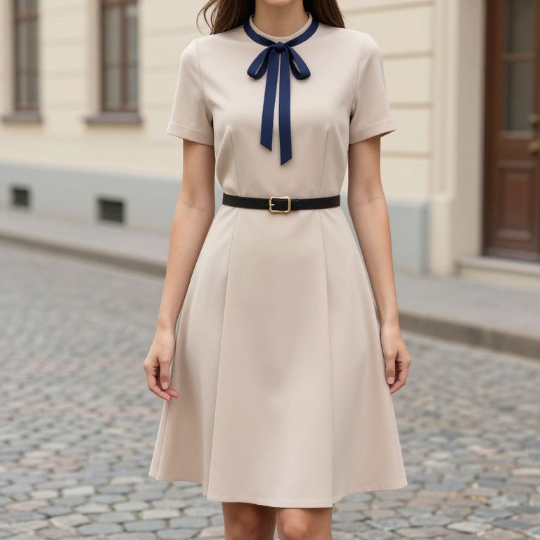 Female wearing a beige dress with a blue ribbon around the neckline and a black belt around the waist. She is standing on a cobblestone street with a building in the background.