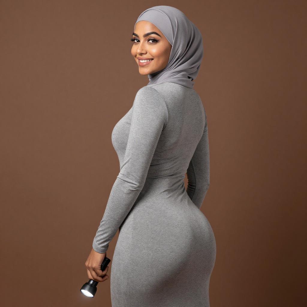 Photograph of a smiling woman with light brown skin and dark eyes, wearing a gray hijab and a tight, long-sleeve, gray dress that accentuates her curvy figure and large buttocks. She holds a flashlight in her right hand, standing against a brown, ured wall. She looks over her shoulder, showcasing her confident pose.