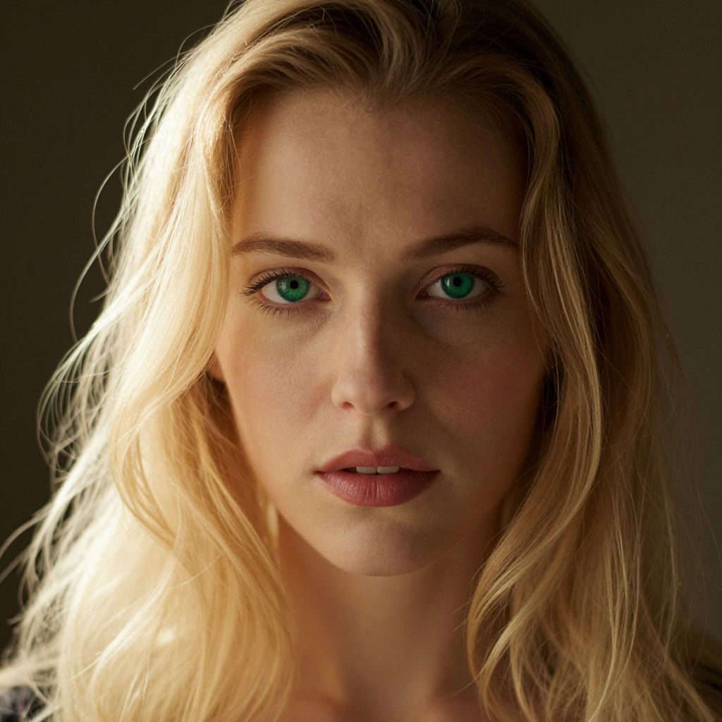 Photograph of a blonde woman with green eyes, light skin, and wavy hair, illuminated by soft light against a dark background.
