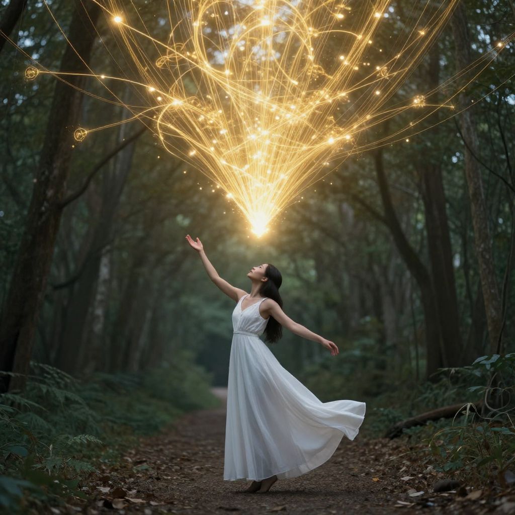 A serene digital artwork depicts a young woman in a flowing white dress standing on a forest path, her arms outstretched toward a radiant burst of golden light above, where glowing strings of energy intertwine like poetic expressions, evoking a mystical and ethereal atmosphere.