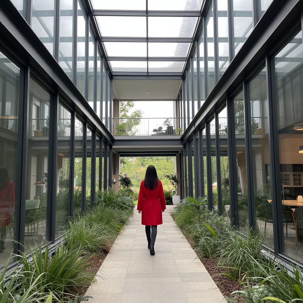 Modern glass-and-steel architecture frames a serene outdoor corridor lined with lush greenery, where a woman in a vibrant red coat walks toward the horizon under a transparent roof, surrounded by reflective windows and contemporary furnishings visible inside.