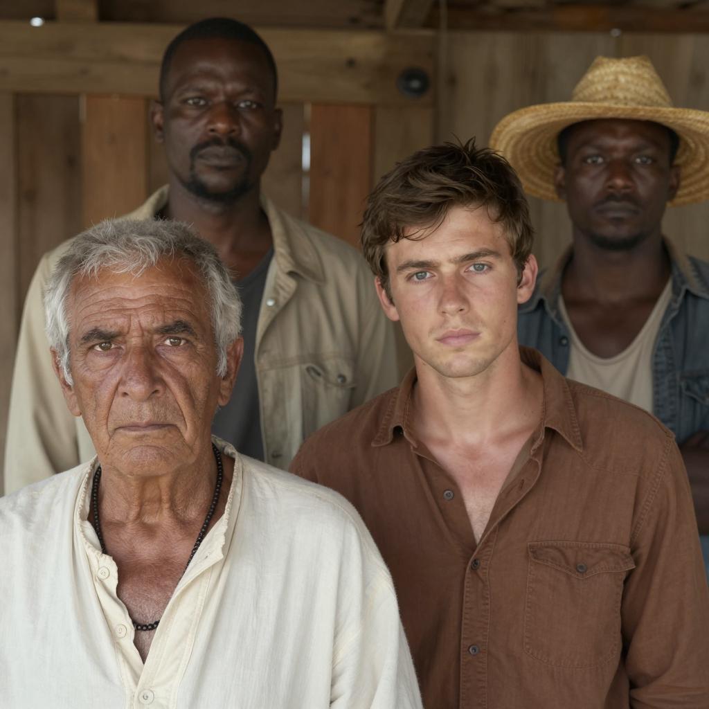 A dense jungle with two people. Foreground: a man with dark skin, rugged face, wearing a brown hat and light-colored shirt, profile view. Background: a woman with light brown hair, red shirt, slightly out of focus. Both look intently forward. Palm leaves and greenery fill the background.