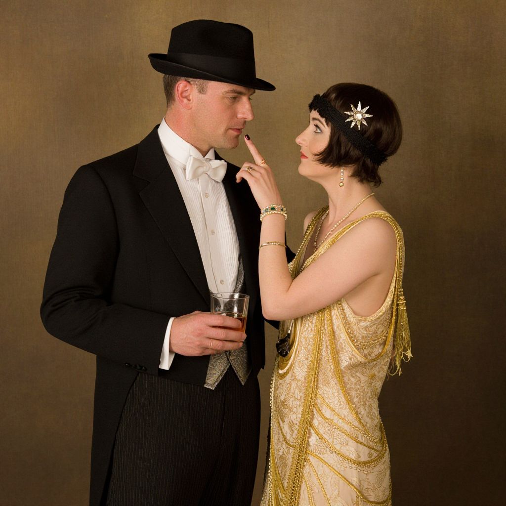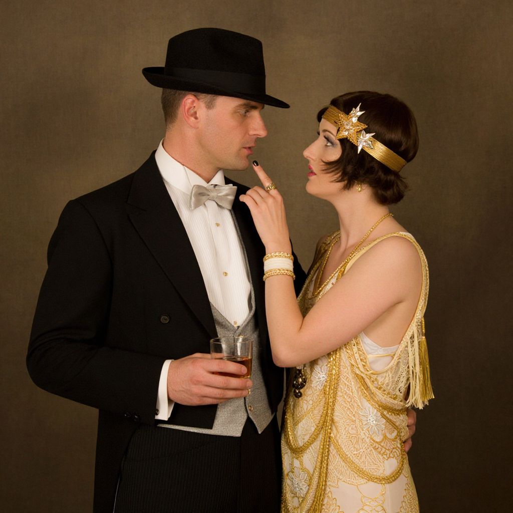 Elegantly dressed couple from the Roaring Twenties, Doctor Ojiplático and Hamish Blakely, stand in a vintage painting setting, with the man in a black tuxedo and fedora holding a glass of amber liquid, while the woman in a gold lace dress adorned with a star headpiece gently touches his face.