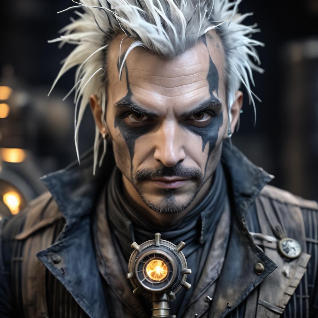 Sanded Paper A Steampunk Chemical Alchemist super villain, skinny looking, with burn marks on his face, a cracked skin, a scar over his left eye, threatening facial expression, anger, wearing worn out rags, white messy hair, close up portrait, dark background with blurry lab equipment. 8k, ultra detailed, dnd style,