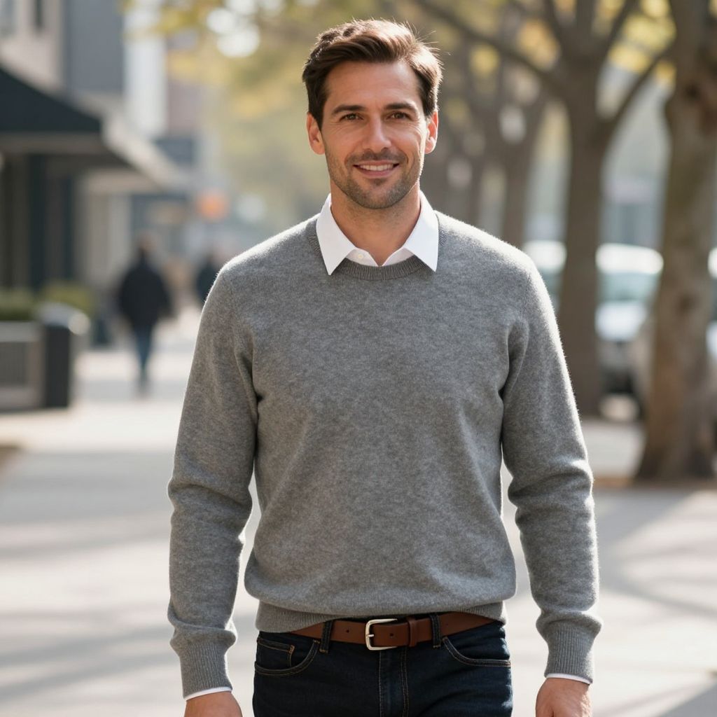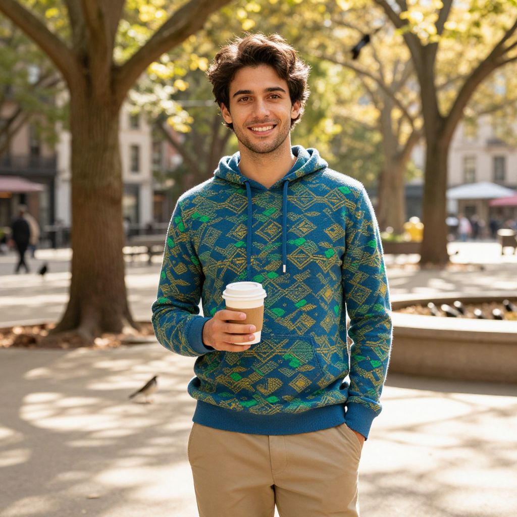 A man with short brown hair, warm brown eyes, and a friendly smile, wearing a bright orange button-up shirt, blue jeans with a black belt, standing in a sunny park setting with a slight breeze, holding a coffee cup in one hand and looking directly at the camera with a calm, confident expression.