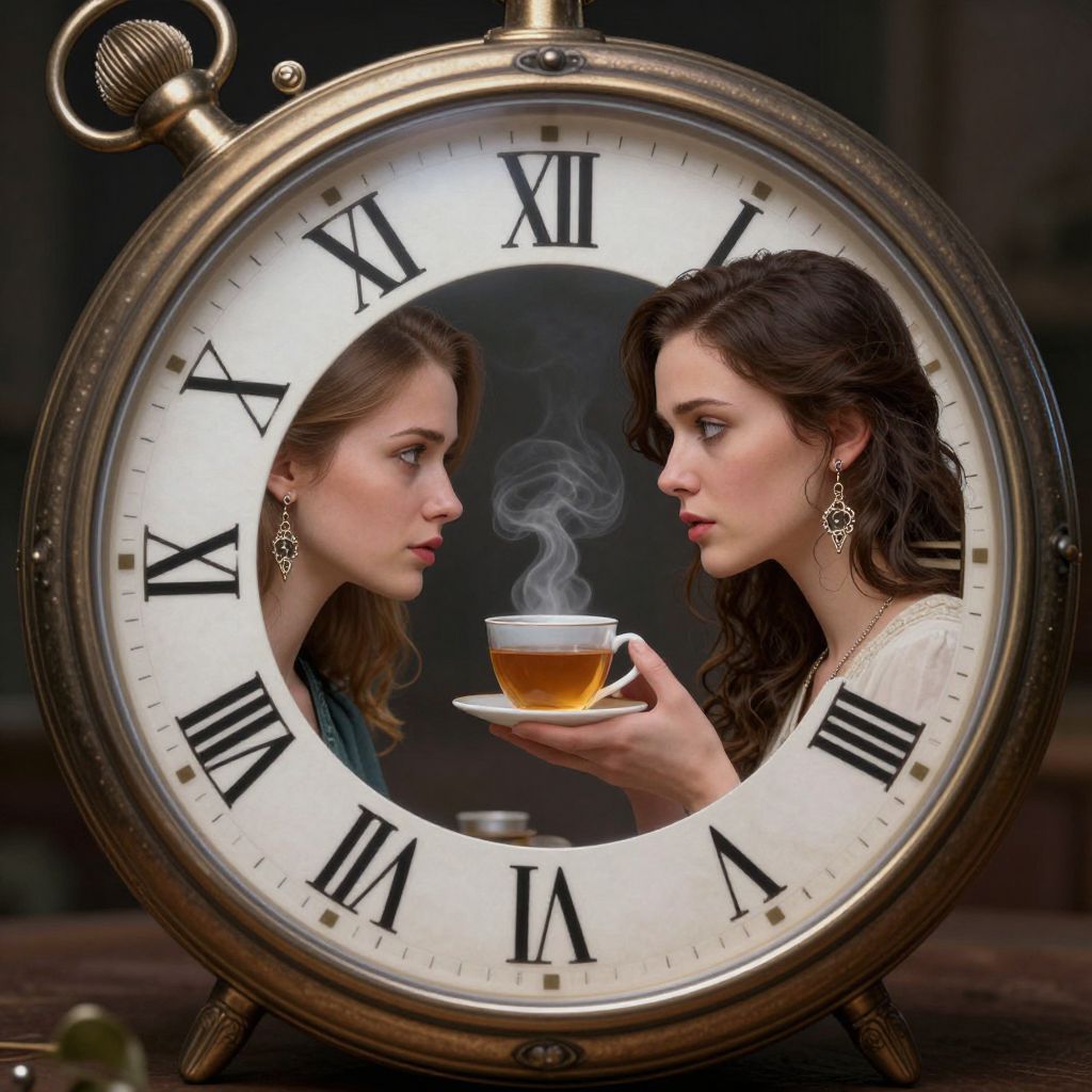 In a surreal digital artwork rendered in high-definition detail, a woman faces her past self through a pocket watch-shaped portal, both adorned with delicate earrings and sharing a moment of introspection over a steaming cup of tea, symbolizing the fluidity of time and emotion.