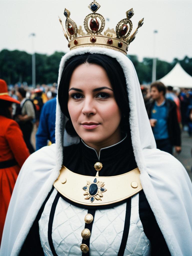 Person in Queen Costume, cosplay festival photo, photorealistic realism