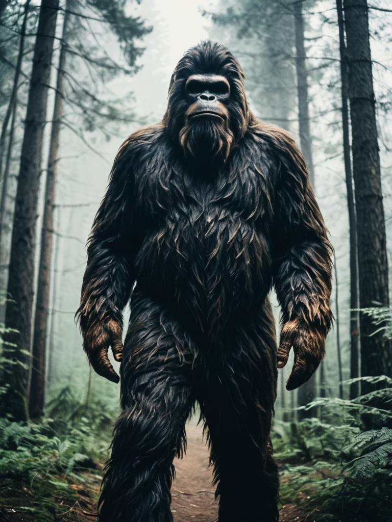 Man in Bigfoot Costume, photorealistic outdoor misty forest portrait