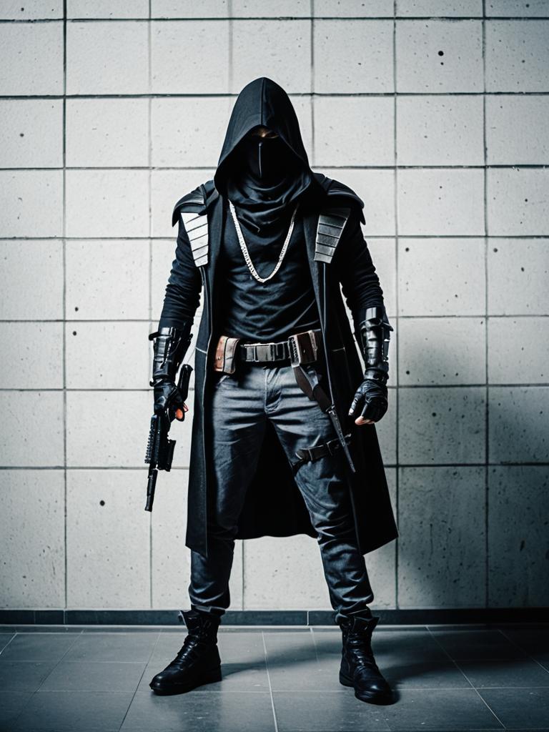 Full-body portrait of a man dressed in a modern assassin cosplay outfit. He is wearing a black hooded coat, a stylized mask covering his face, black tactical gloves, and knee pads. The outfit includes metallic arm guards and a pendant necklace. He is holding a modern assault rifle and has a sword strapped to his back. The background is dark, highlighting the character's dark and mysterious aesthetic.