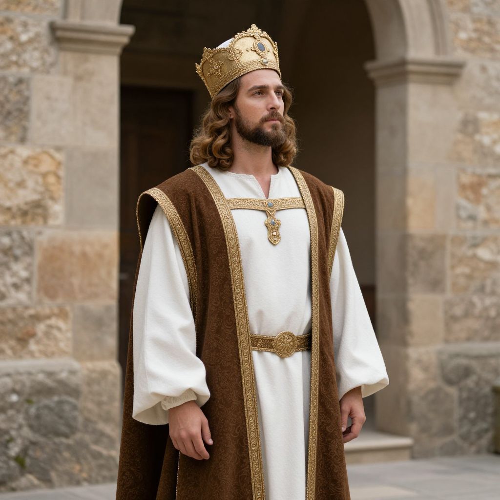Photograph of a Caucasian man with long brown hair and a full beard, wearing a gold crown and a medieval-style white tunic with a brown, gold-trimmed robe. The tunic is cinched at the waist with a gold belt. He stands in front of a stone building with a large archway, displaying a solemn expression. The stones of the building are a mix of beige and gray, with visible texture and age. The lighting is natural, highlighting the rich colors and textures of his attire. The background is slightly blurred, focusing attention on the man.