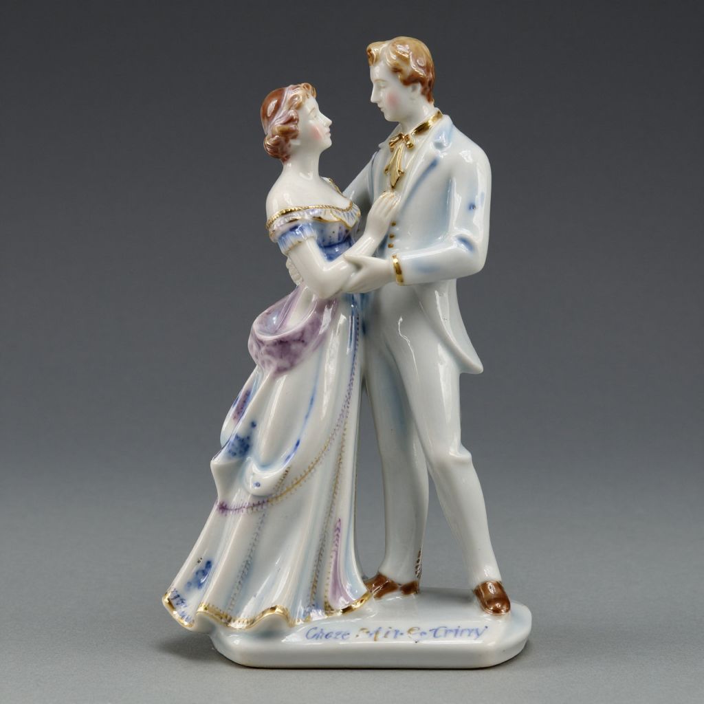 A finely crafted porcelain figurine in the classic Frankenthal style depicts a man serenading a lady, showcasing intricate detailing and a timeless, vintage aesthetic.