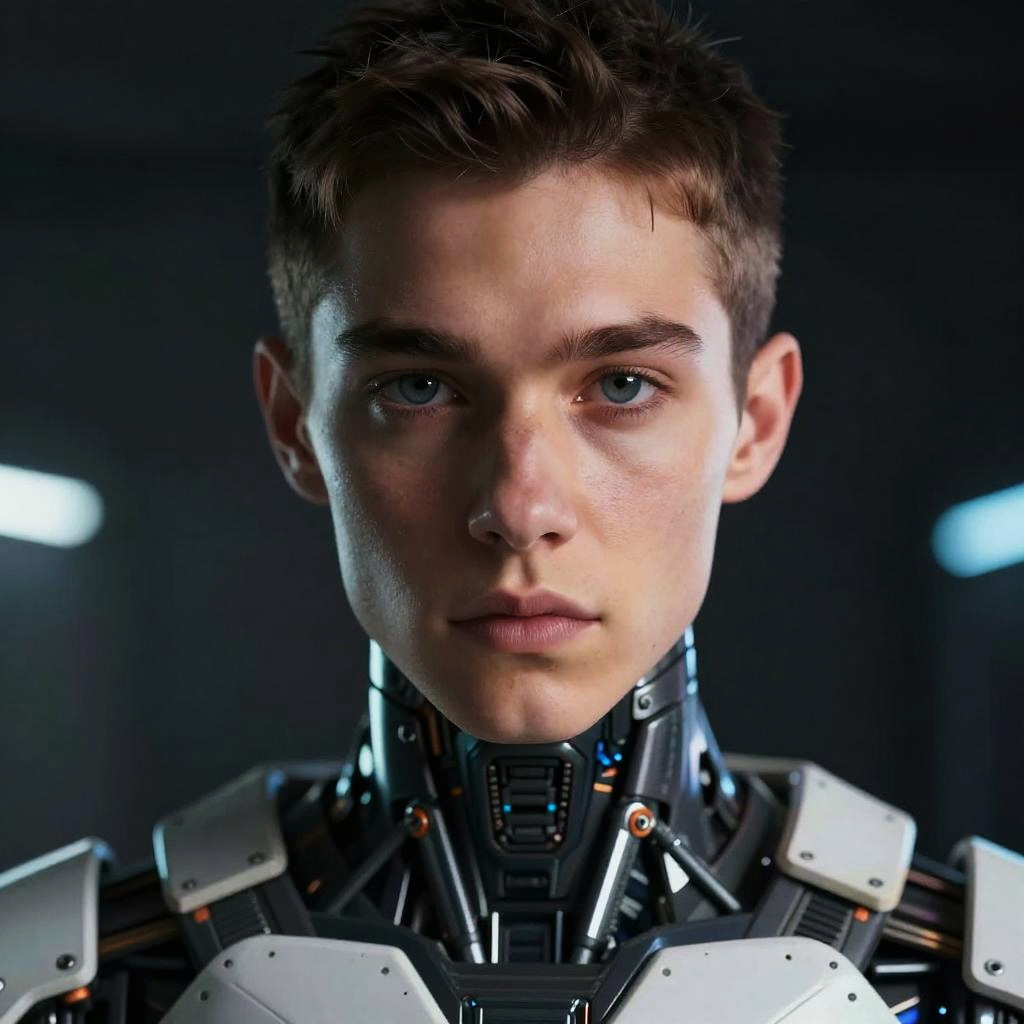 Photorealistic CGI of a young man with short brown hair, blue eyes, and a cybernetic neck and shoulder armor, staring intensely in a