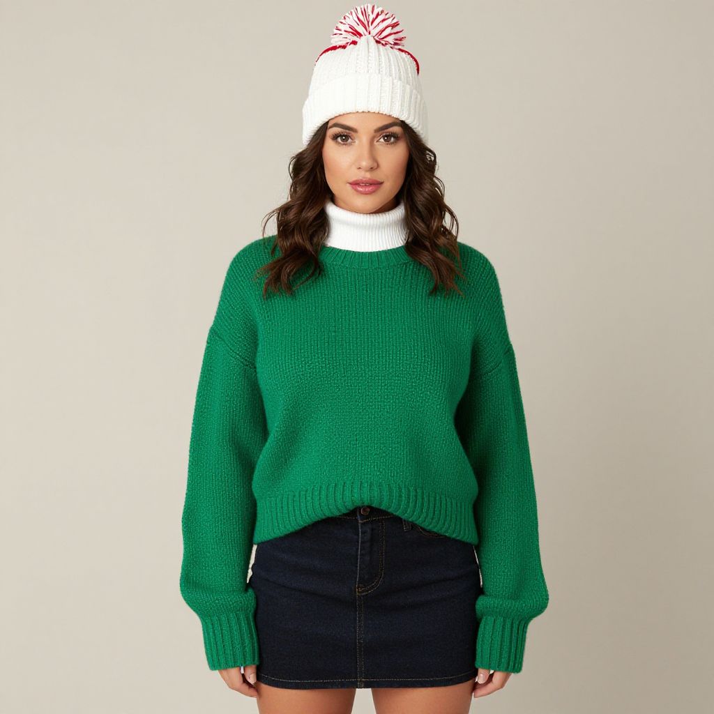 "Woman, casual winter, chunky knit green sweater, long sleeve, ribbed hem and cuffs, layered over white turtleneck, dark denim miniskirt, white pom-pom beanie with red and white striped detail, neutral plain wall background.. Sexy. Pretty face and beаutiful eyes. Big breasts."
