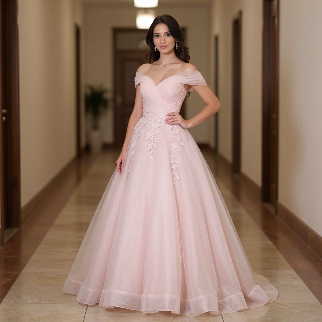 Photograph of a confident woman standing in a long, narrow hallway with beige walls and wooden doors. She has long, dark wavy hair and wears an off-the-shoulder, pale pink ball gown with a fitted bodice adorned with delicate floral embroidery and a voluminous tulle skirt. Her right hand rests on her hip, and she gazes directly at the camera with a slight smile. The hallway is illuminated by ceiling lights, and a potted plant is visible in the background. The floor is tiled in a light beige color.